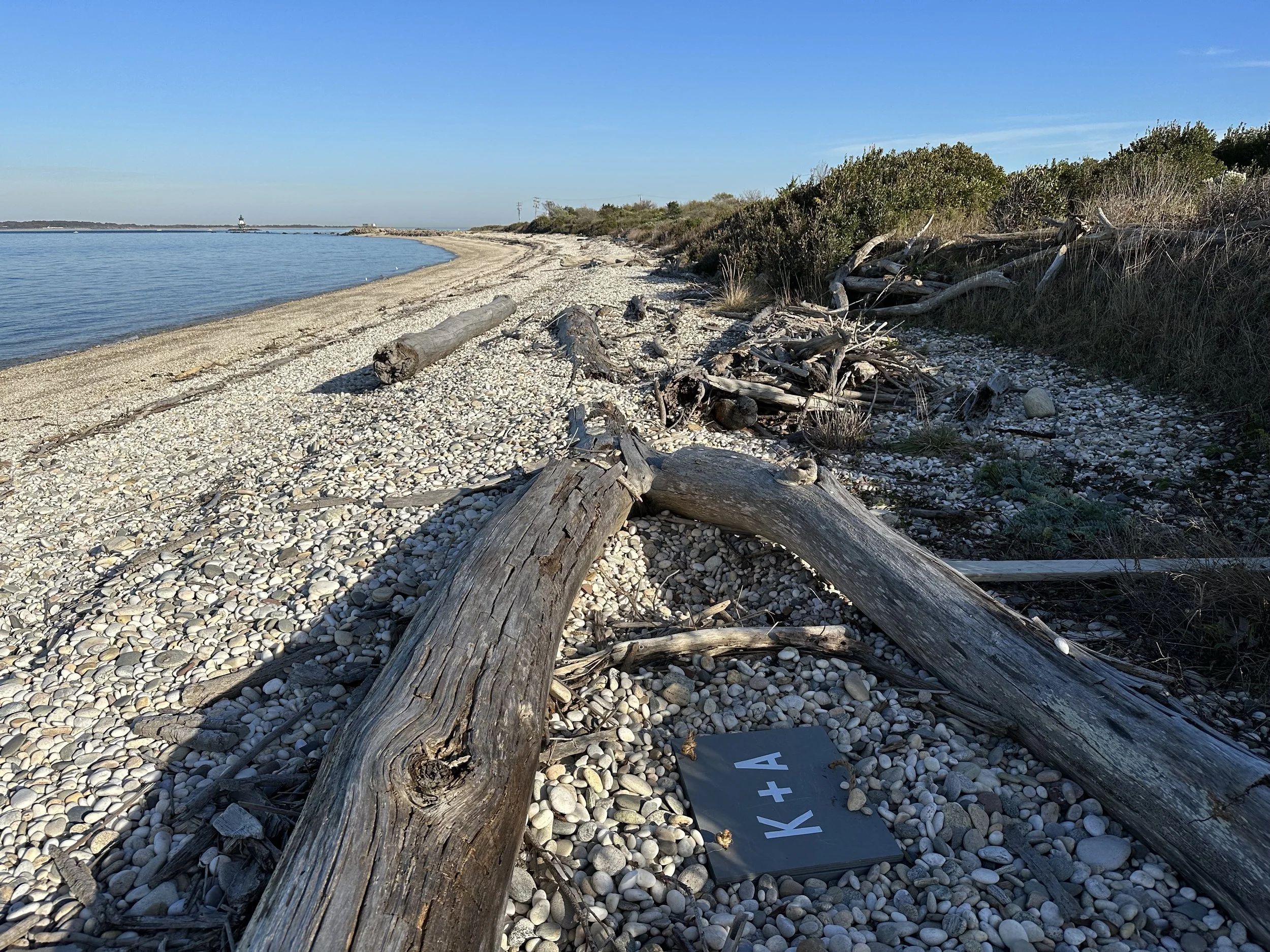 Below is a view of the precise location of Treasure for MAP K + A. The hunt begins at the parking lot for the Orient Point County Park, directly across the street from the Cross Sound Ferry dock. Take the path until you reach the ‘T’ intersection with another path. Go right. Then immediately look for a dirt pasth that leads down to the beach. Then start walking to the right (EAST). Go for about 100 paces to find the rusty metal pole shaped with a curly-q end. (* Paces = a normal adult stride) Then continue in same direction for another 120 paces. Look for a fallen tree in the shape of a wishbone near the top of the beach closer to the bushes. The treasure lies inbetween the wishbone branches, just 7 paces west of the inside corner.